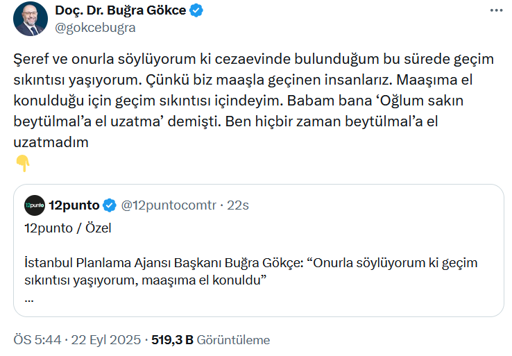 İstanbul Büyükşehir Belediyesine (İBB) yönelik operasyon kapsamında 23 Mart 2025’ten bu yana tutuklu bulunan İstanbul Planlama Ajansı Başkanı Doç. Dr. Buğra Gökçe, Silivri’deki Marmara Cezaevi’nde 12punto’ya konuştu.