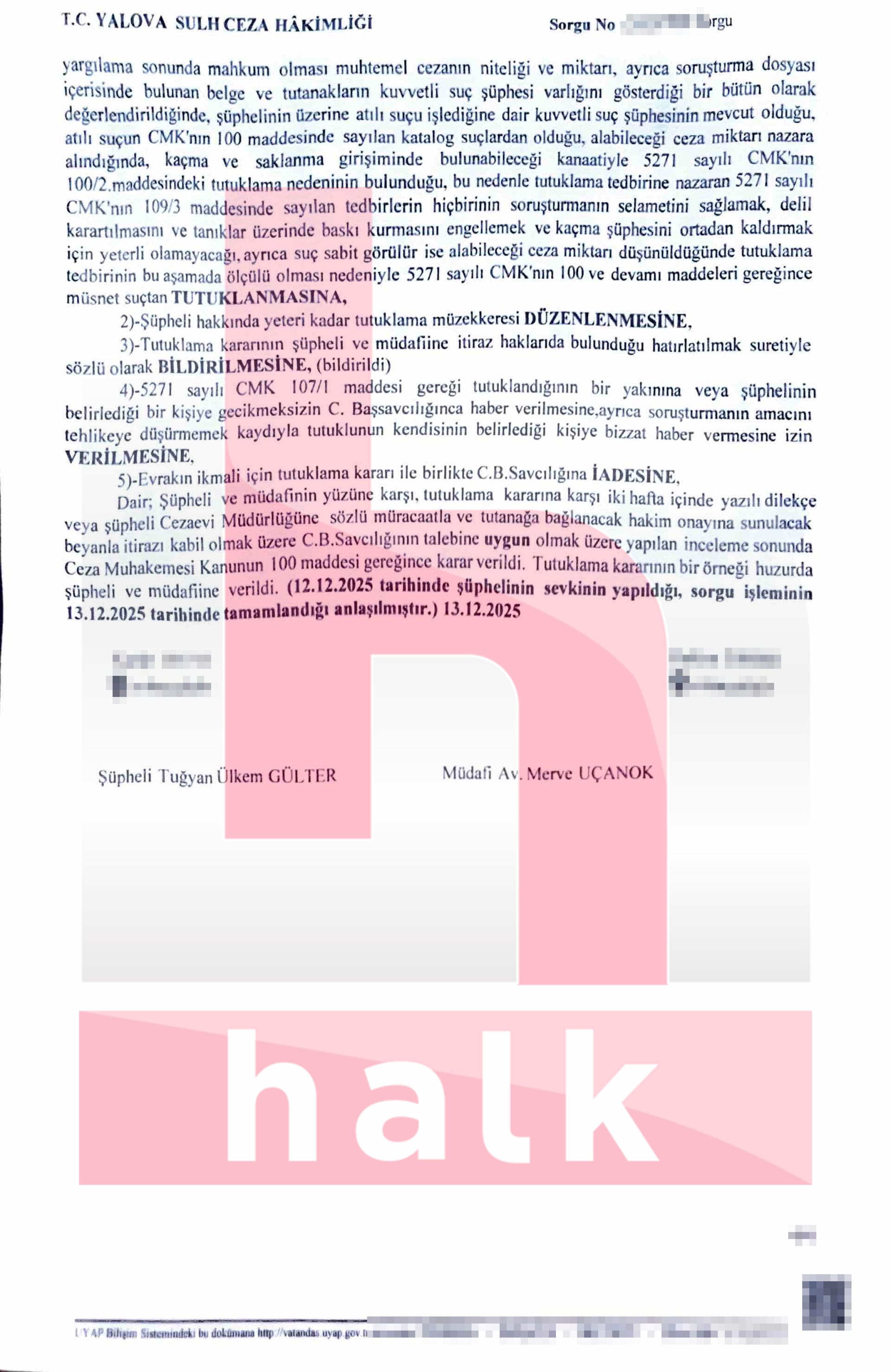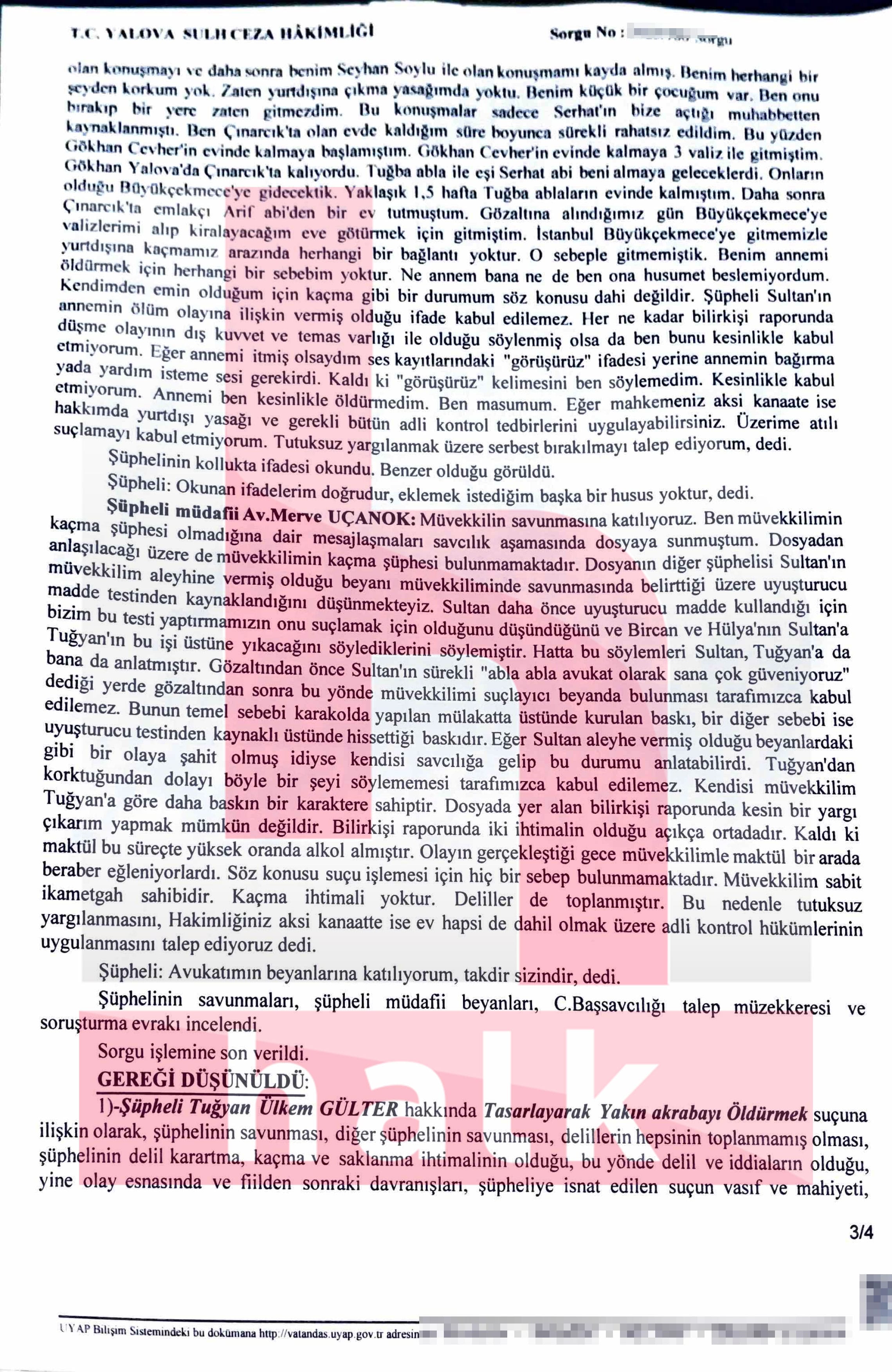 Savcı, Tuğyan Ülkem Gülter‘i “tasarlayarak kasten yakınını öldürme” suçundan tutuklanması talebiyle sulh ceza hâkimliğine sevk etti. Gülter tutuklandı. Halktv.com.tr Gülter’in hem savcılık hem de karakol ifadesine ulaştı.