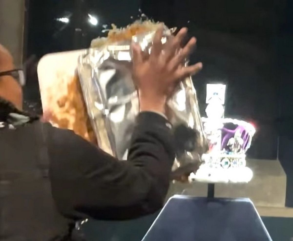 Londra’da sergilenen Kraliyet Tacı’na tatlı fırlattılar